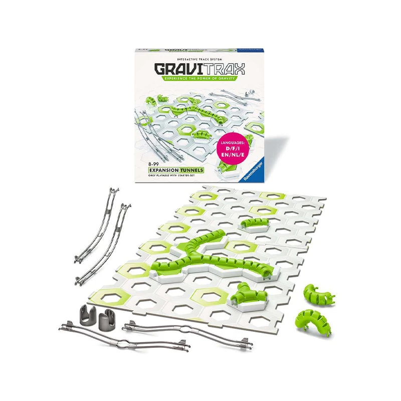 Experience the power of gravity! GraviTrax is the all Contruction toy STEM track system from Ravensburger! Use your imagination to build superb tracks and set the gravity spheres rolling! Create the element of surprise! Use the Tunnels to hide the marbles as they travel through your track. Combine the Tunnels with your GraviTrax Starter-Set for added mystery to your track. Will you be able to keep your eye on the marble as it rolls through the tunnels?
