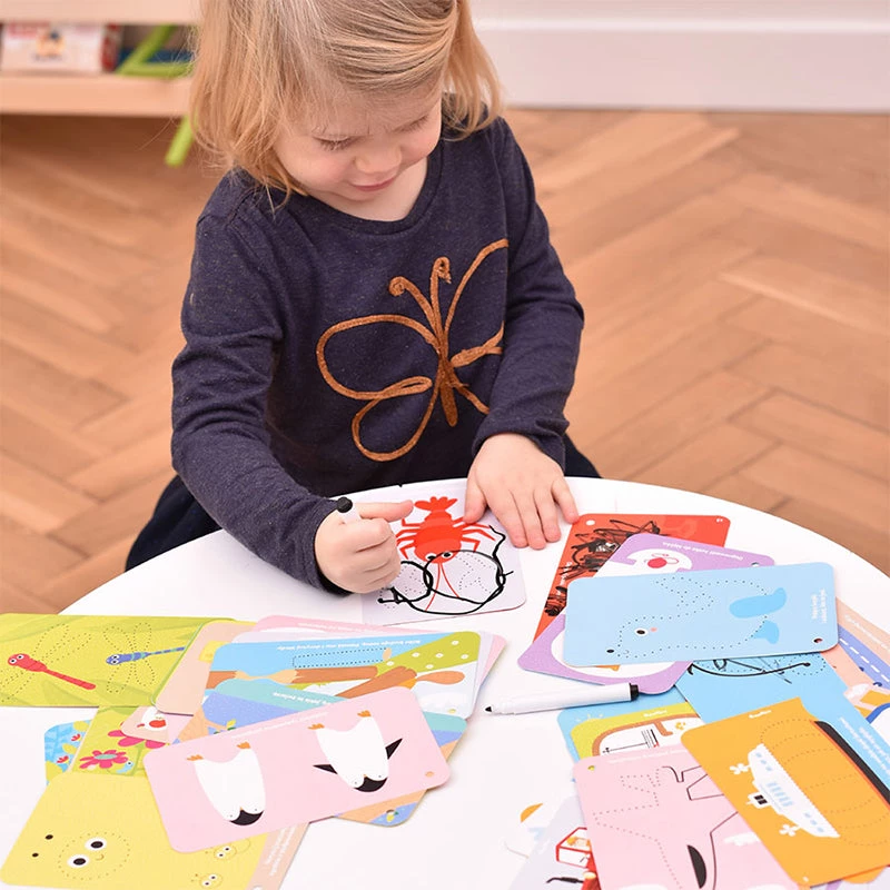 Various types of activities invite kids to engage in graphomotor exercises such as: tracing lines, finishing patterns, reproducing shapes or drawing in missing elements. They allow kids to develop perceptiveness and greater awareness of their surroundings, and prepare them for learning to read, write, and count. Creative play will bring future benefits β scribbling trains the imagination and boosts creativity, which has a positive effect on learning and memory. A handy format with a practical string binding allows you to use the cards anywhere: at home, kindergarten, and on the go.