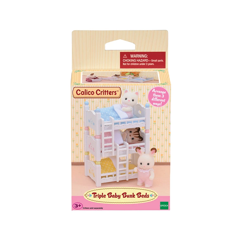 Calico babies love their cozy beds! Beds can be positioned in 3 fun ways. Stack them like bunk beds, arrange them like a pyramid, or simply use them as 3 separate beds. Complete with mattresses/pillows, blankets & 2 climbing ladders.