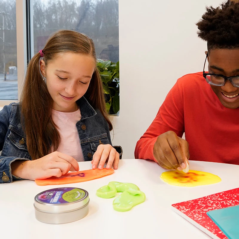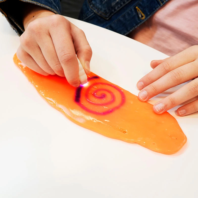 Use the Glow Charger to encrypt this neon orange putty with purple drawings that disappear before your eyes.