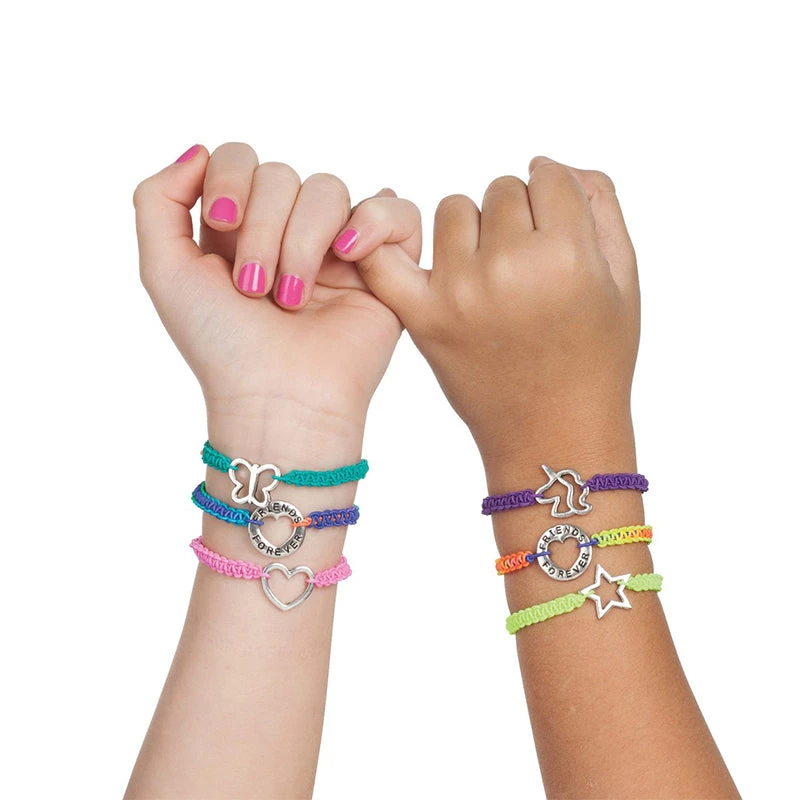 Includes illustrated instructions, 6 silver charms, multicolored cords and beads.