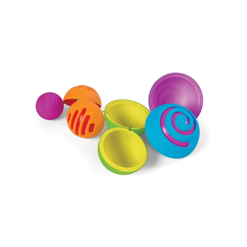 Set of textured, tethered balls that open up and nest inside each other