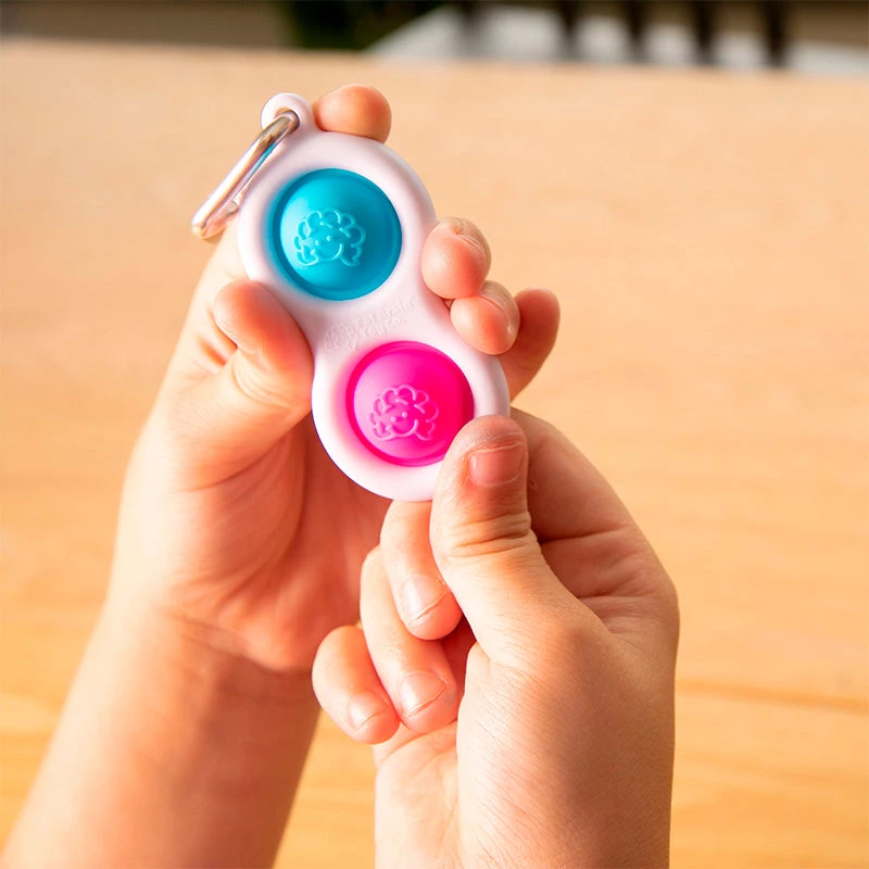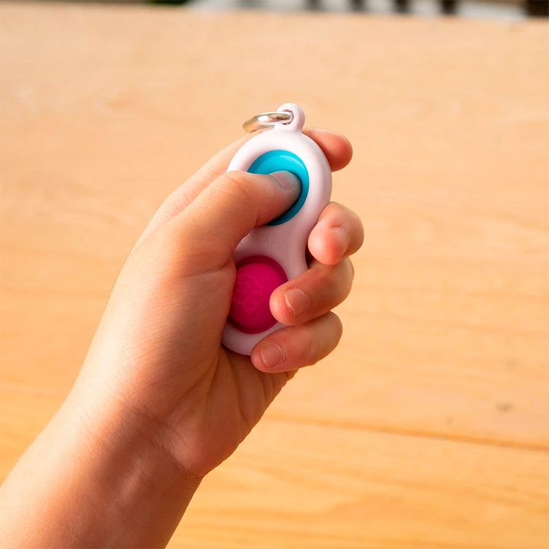 Young or old, this unique little keychain provides endless hours of fidget fun! The frame is made of strong, high-quality plastic – ideal for rattling around in your pocket or purse – and the two colorful buttons are made of 100% silicone. One-touch and your fingers can’t stop pushing, poking, and popping! Available in four brilliant color combinations and perfectly sized to fit any set of keys, the Simpl Dimpl is a simple delight that’s hard to resist. Simpl Dimpl Unique key chain featuring silicone fidget buttons Encourages tactile stimulation, calmness, concentration Fidgety fingers can’t put it down! Buttons each textured on one side with the Fat Brain Toys logo Mini carabiner clip makes it easy to attach and detach from keys, purse, backpack Comes in 4 assorted color combinations Color choice, not available Purchase includes one Simpl Dimpl key chain Frame made of high-quality ABS plastic Buttons made of 100% silicone.