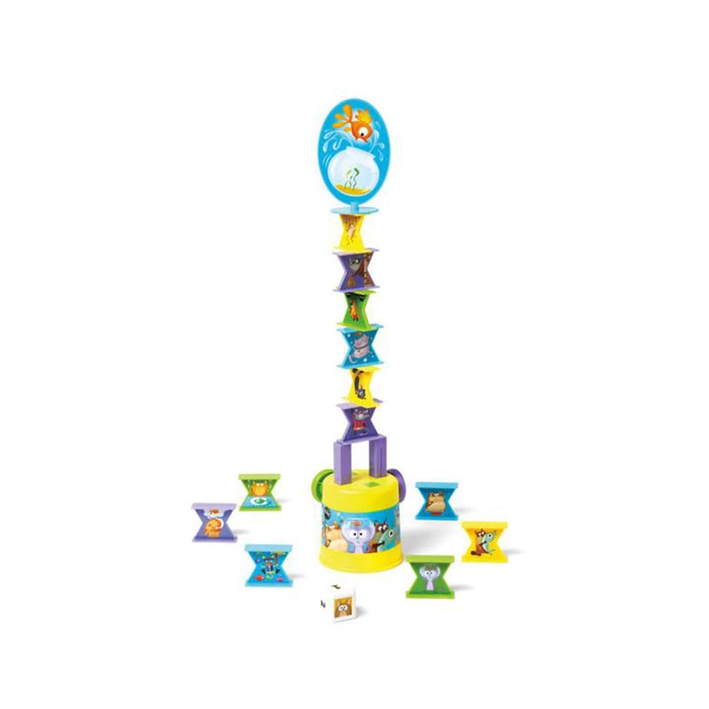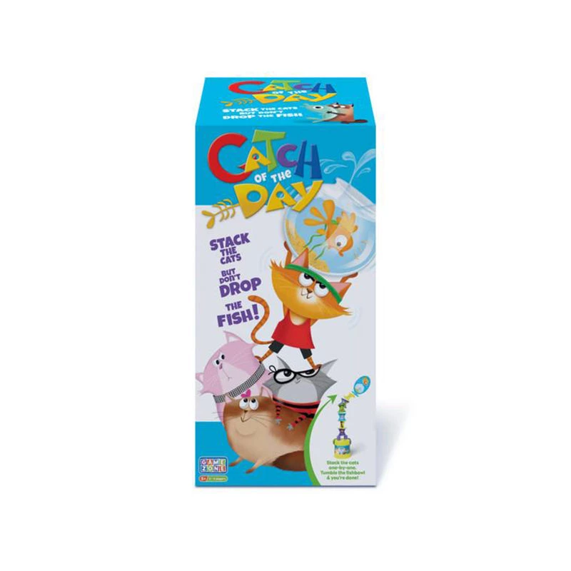 Stack the cats, but don’t drop the fishbowl! The objective of Catch of the Day is to stack all your color game pieces without knocking over the fishbowl!