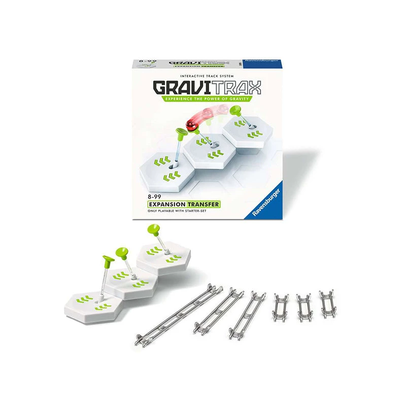 Propel the action! The Transfer takes your marbles over a breath-taking gap for a spectacular eye-catcher! Combine the Transfer with your GraviTrax Starter-Set to get your marbles across longer distances. How far will your marbles travel?