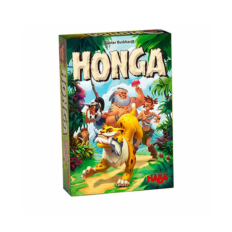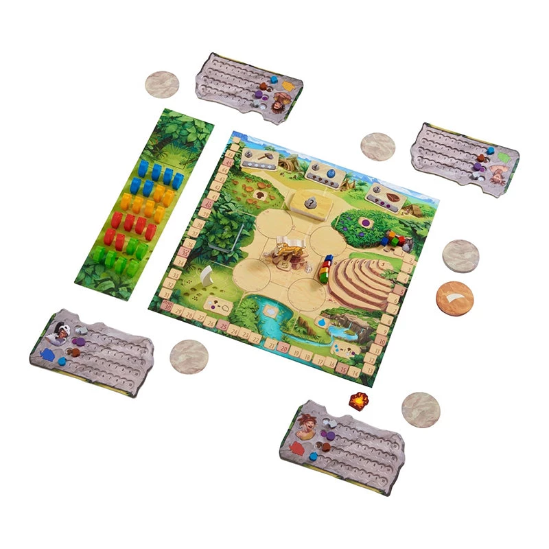 Contents: 5 player trays, 1 Honga figure, 1 depot board, 1 game board, 46 action disks, 32 barter cards, 25 bonus cards, 1 mammoth tooth, 1 starting player fire marker, 30 mammoths, 5 cavemen, 5 scoring markers, 20 food markers, Set of instructions