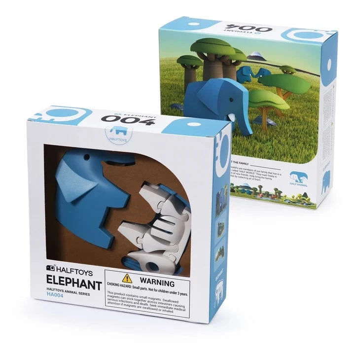 HALFTOYSยฎ Elephant is part of a collectible Half-Animal series that combines multiple play stylesย into one package. Complete with a diorama for an immersive savanna adventure, the toy has interactive magnetsย to satisfy snapping needs and a skeleton puzzle for endless tinkering. Collect and connect them all to create your own Savanna.