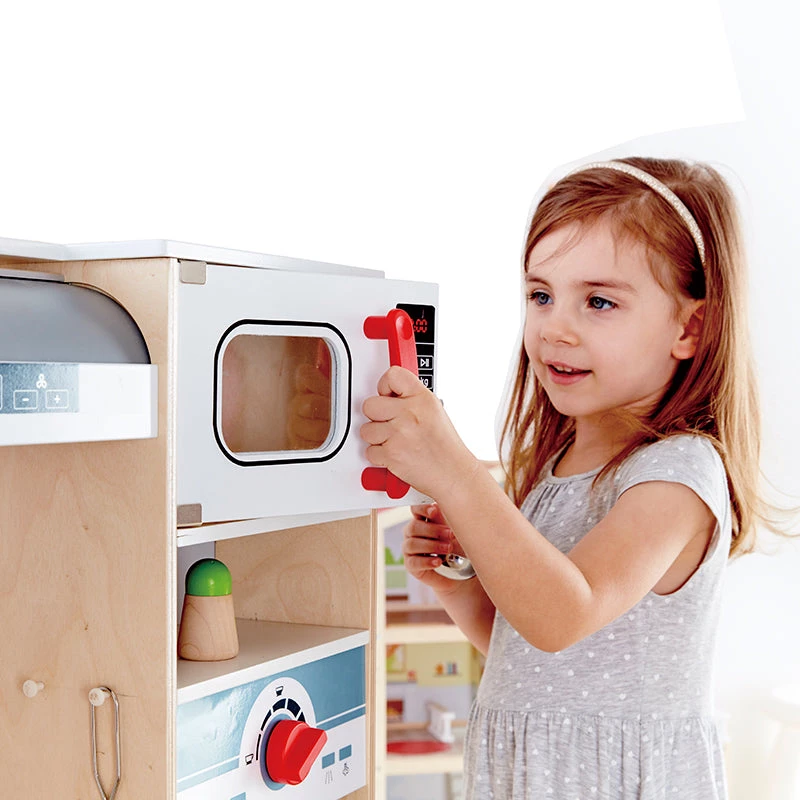 Children will love this multi-functional, All-in-1-Kitchen and its array of charming appliances and features, including a controllable range hood lamp and authentic microwave “ding”.