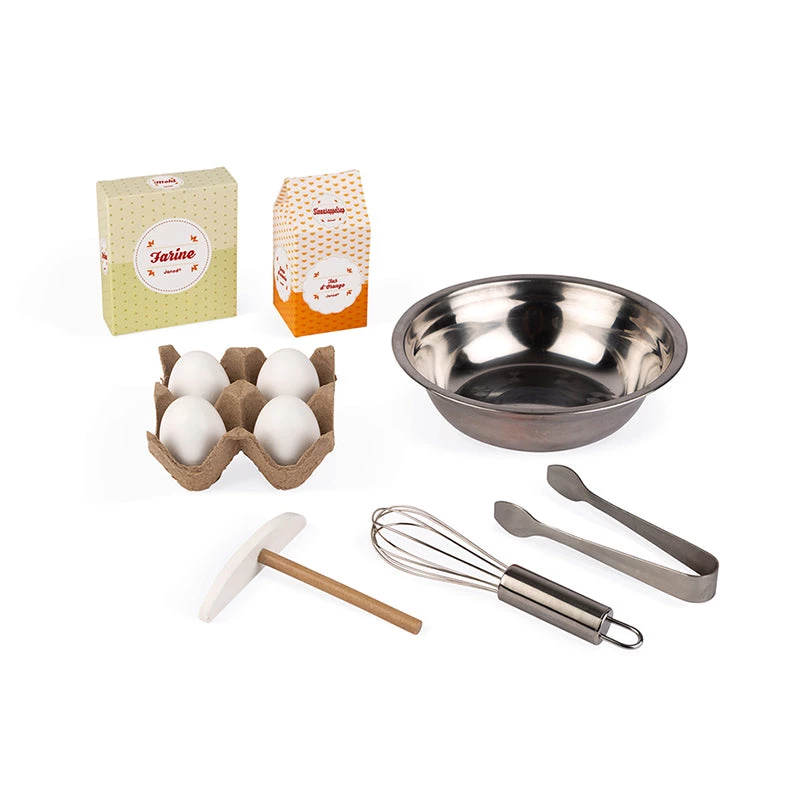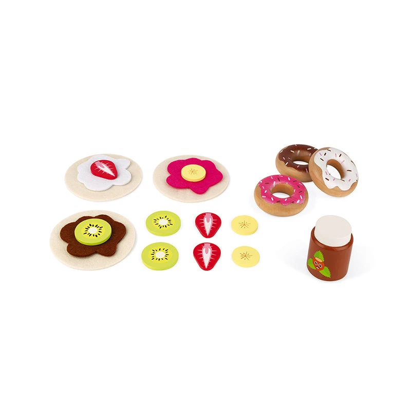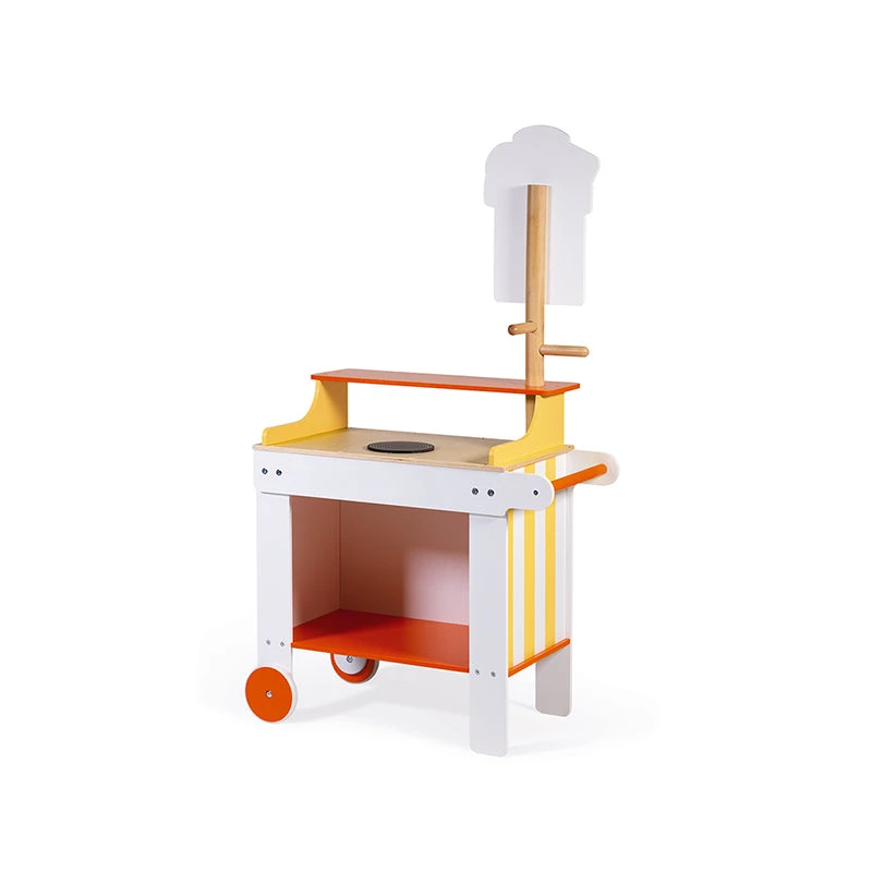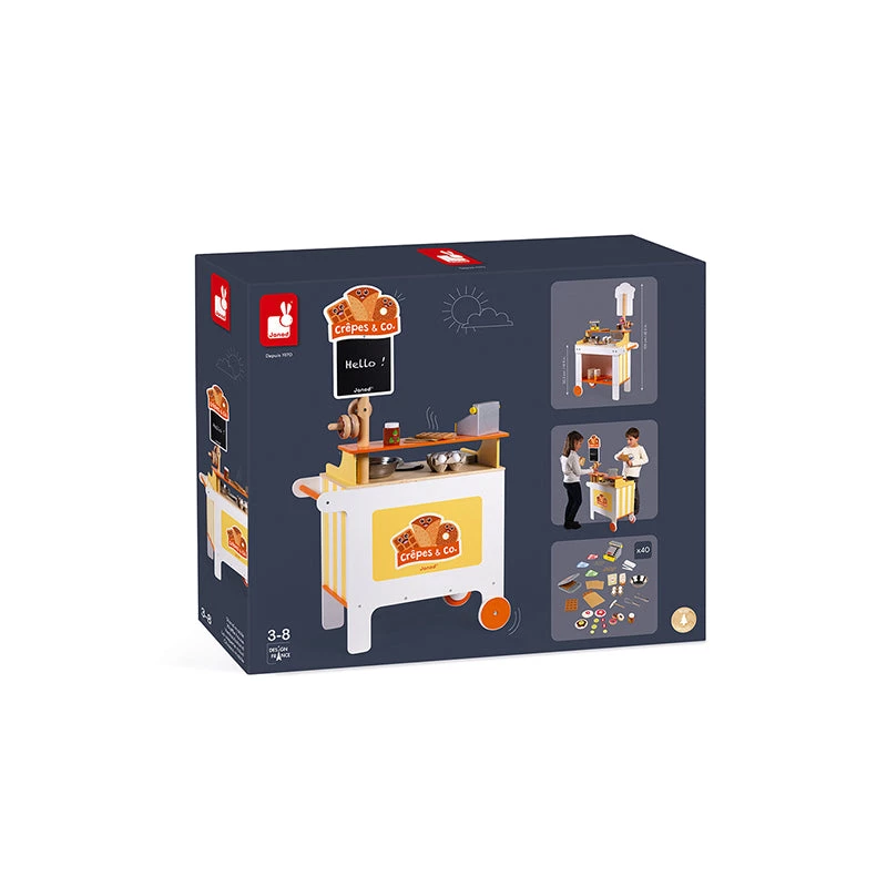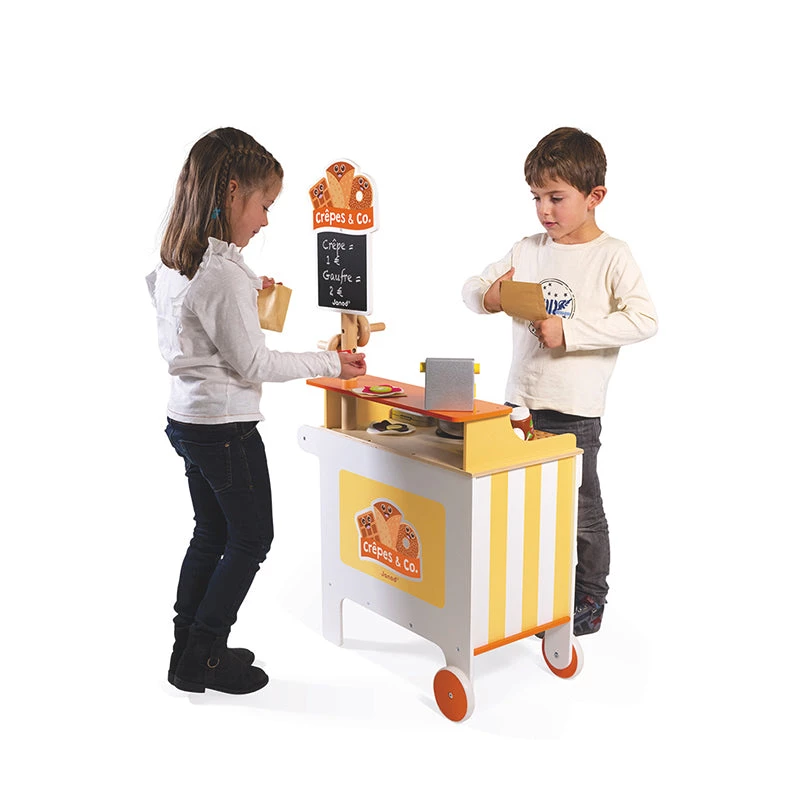 To make good crรชpes, you need : an easy-to-move ‘Crรชpes & Co’ mobile stand with 40 accessories : 1 cash register, 1 set of coins and notes, 1 waffle iron, 3 waffles, 3 donuts, 1 box of 4 eggs, 1 jar of spread, 3 crรชpes, 3 ‘fillings’ for the crรชpes, 1 bowl, 1 whisk, 1 crรชpe rake, 9 pieces of sliced fruit, 1 pair of tongs, 3 Kraft paper bags , 2 cardboard boxes of food and 1 box of chalks. By putting themselves in the shoes of small traders selling donuts and waffles, your children will develop their imagination and refine their movements to gain independence. The small slate on the front displays the opening hours and specials of the day. Worktop height : 50.5 cm.