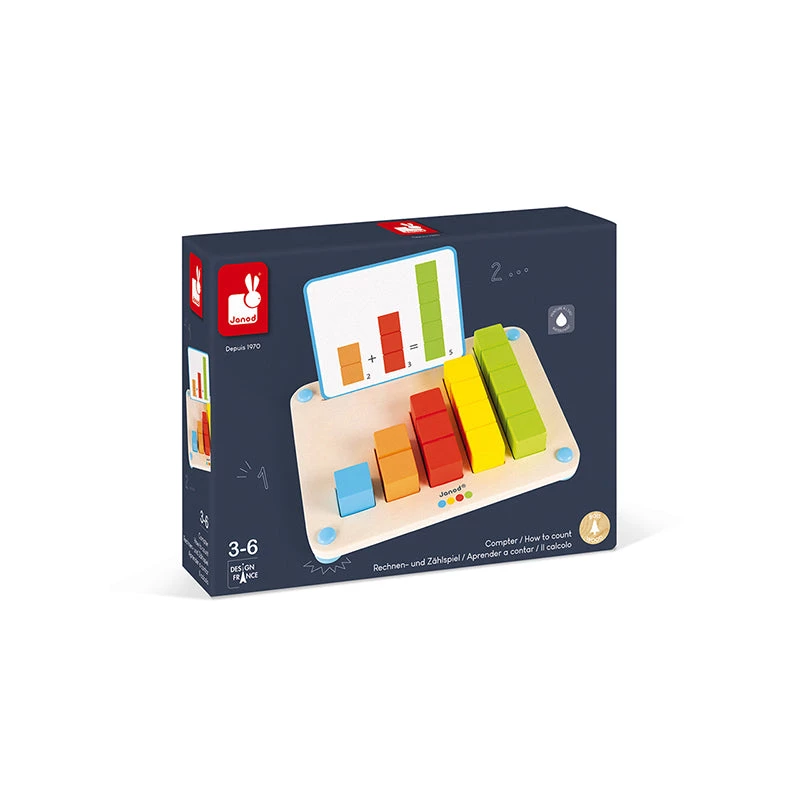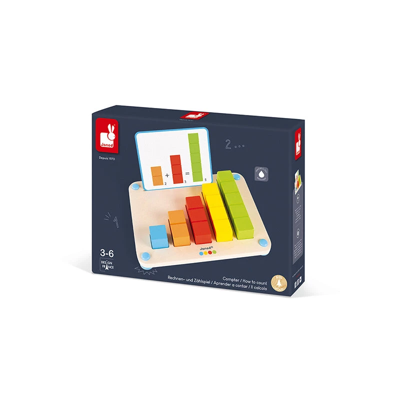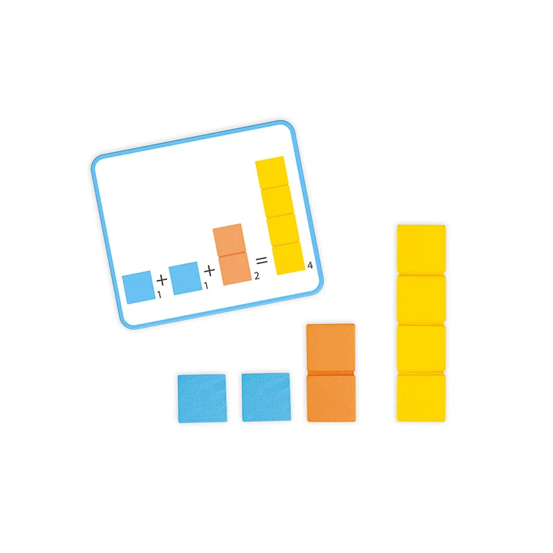 This educational game helps your child to learn how to count and to become a math whiz while having fun! The game features 12 patterns and 14 graduated bars of different colors and sizes, providing children with 2 ways to play: 1.Beginners place the sticks in the right location on the board to count up to 5 or to visualize the different ways to count based on the pattern. 2. Experts perform the first additions outside of the board based on the pattern. How much is one orange bar + one red bar? Answer:one green bar. As a clever feature, this board is equipped with silicone non-skid feet for added stability. This product helps to develops: discovery, experimentation and numbers. Pieces painted using water-based paints. Wood : plywood (tray), cherry (blocks).