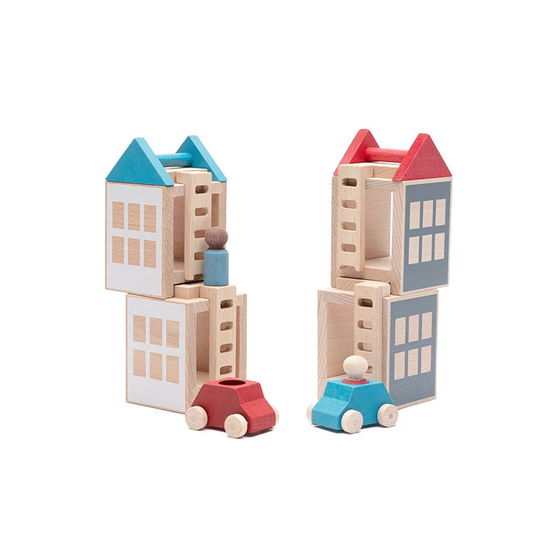 The Lubu Town Pack Summerville is a great, educational and creative construction toy set for boys and girls. It comes with 4 stackable houses with ladders, 2 toy cars with wooden figures and 2 roofs. This unique toy with a modern design in red and turquoise allows children to create different buildings and enjoy a fun time with their own constructions, the wooden toy cars and the little people.
