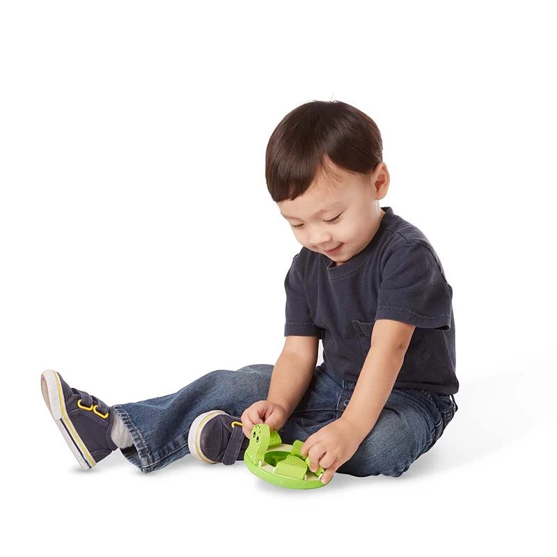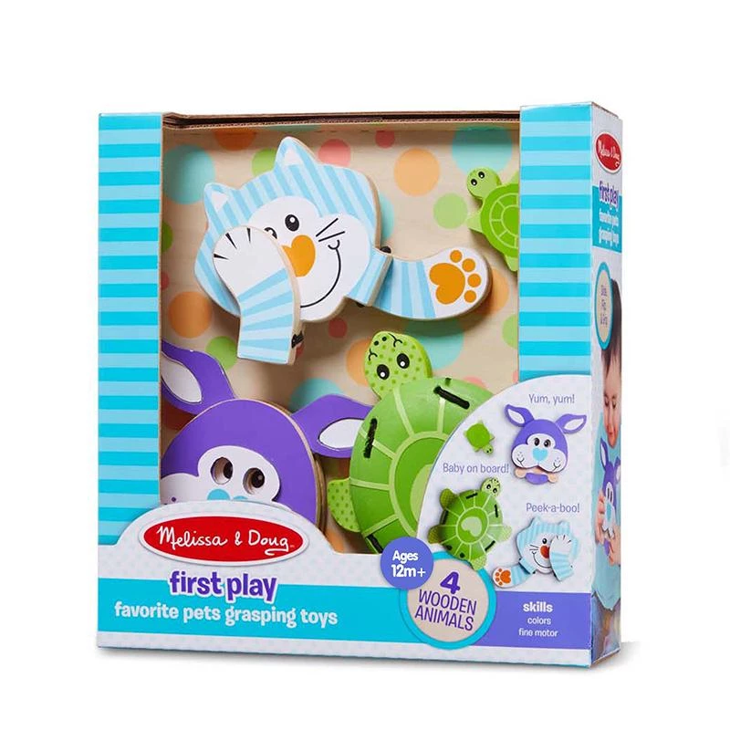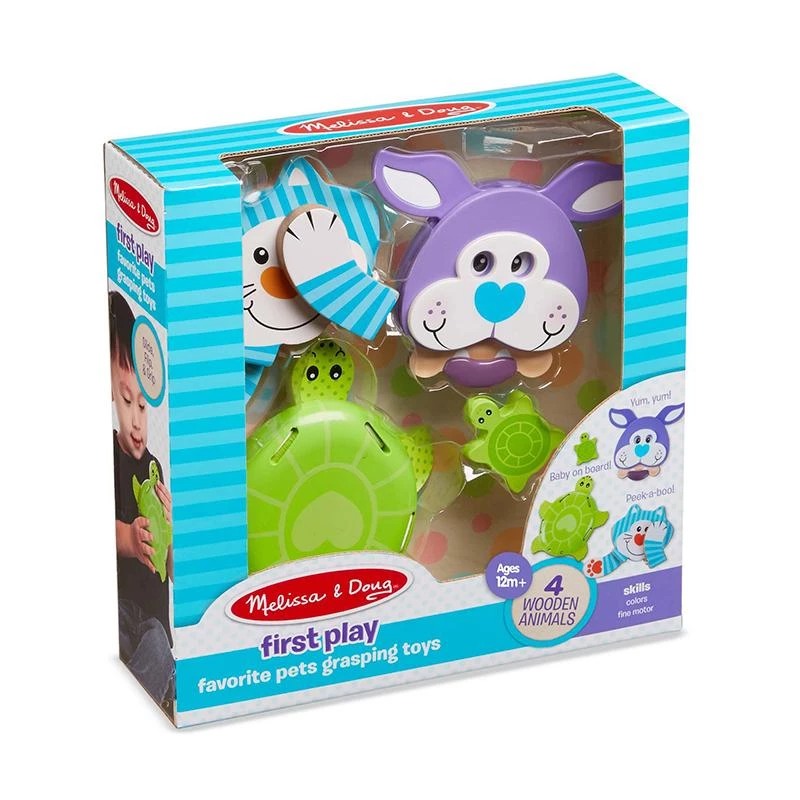 Little hands and big imaginations will love clicking, flipping, sliding, and gripping these adorable wooden animal grasping toys! Slide the puppy’s bone to make its eyes and ears wiggle, flip the kitten’s paws to play peek-a-boo, and lift the turtle’s legs up to reveal a mirror and a baby turtle cuddled inside! Engaging hands-on play for babies and toddlers 12 months and older helps promote color recognition, fine motor development, and more. First Play toys feature bright colors, bold patterns, and whimsical designs that boost skills while sparking imagination and wonder–right from the start!