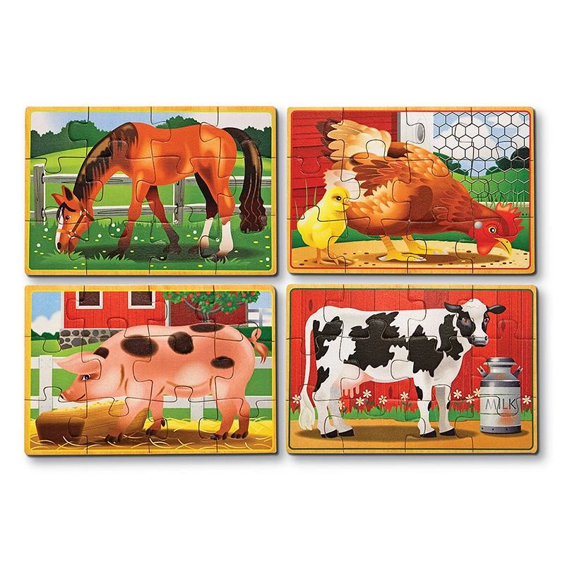 - Farm animal-themed puzzles depict a horse, chicken, pig, and cow.