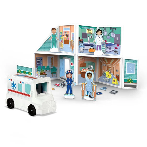 Build an imaginary world to take care of patients with the Magnetivity Magnetic Building Play Set Hospital! Magnetivity encourages kids to experiment, explore, and imagine by inspiring them to design and build their own unique worlds! The 16 double-sided panels with artwork on both sides magnetically attach in different combinations, so kids can build new designs for their hospital and ambulance every time they play. The 62 included magnetic accessories stick to the panels and to the two magnetic wooden play figures with stands, inspiring open-ended, hands-on exploration and play! All Magnetivity panels are compatible.