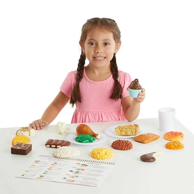 Satisfy hungry imaginations with this 17-piece set of durable realistic play food! Kids three and older will make memorable make-believe meals with the solid, dishwasher-safe and realistically detailed food pieces, while also learning about nutrition and the importance of making and eating balanced meals. Combine & Dine includes proteins (BBQ ribs, a chicken drumstick, lamb chop, salmon filet), grains and starches (mac and cheese, mashed potatoes, spaghetti, rice pilaf), vegetables and beans (cauliflower, green beans, baked beans, and sliced carrots), and desserts (cupcake, orange segment, brownie, apple pie), as well as a four-sided menu and information card. This playful food set lets young foodies create countless combinations to serve well-balanced fun!