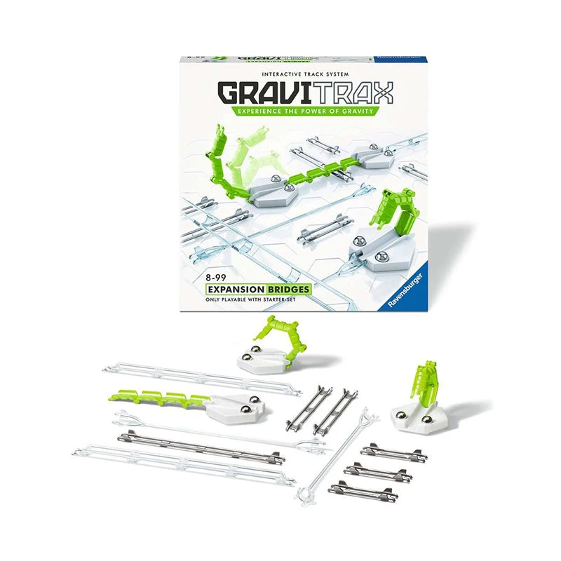Bridge track sections! Bypass large gaps with Bridges. Combine the Bridges with your GraviTrax Starter-Set for even more variety by interlinking track sections for really spectacular results. How many unique track designs will you create?