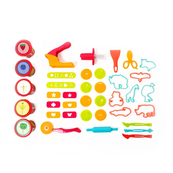 5 100g / 3.5oz tubs of Tutti Frutti modeling dough (vanilla, lemon, strawberry, green apple, blueberry), 1 reusable bucket for storage , 1 stencil strip press, 2 stencil strips, 1 wavy cutting wheel, 1 extruder with 6 changable tips, 8 cutters, 3 modeling tools, 1 rolling pin, 8 shape stamps, 1 plastic scissors, 1 spatula.