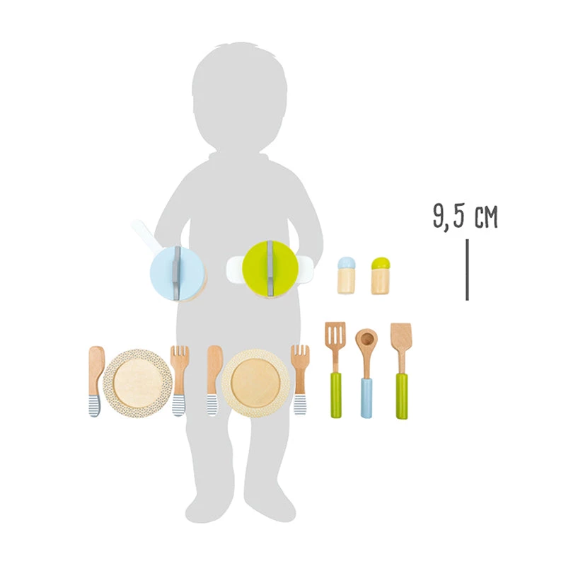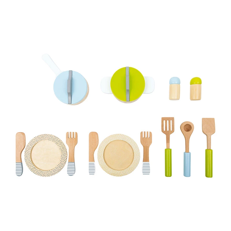 Attention all top chefs! Cooking for the guests is loads of fun with this colourful crockery and cookware set made of robust wood. The removable cookware lids are easily gripped. This is how the children’s kitchen can become a top chef’s kitchen in the blink of an eye while simultaneously training social competencies and the use of cutlery! So, off to the kitchen, we go!ย