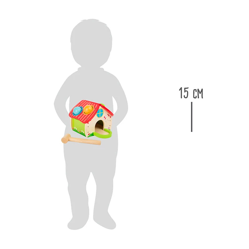 Who’s hammering up there? This delightfully springlike wooden house is really something special. Four different coloured wooden balls should be pushed through the openings in the roof with the help of a hammer. This toy helps train colour recognition and the development of dexterity. The wooden balls roll back out through the incorporated doorway and can be easily retrieved.ย Wonderful powered-up playtime fun!