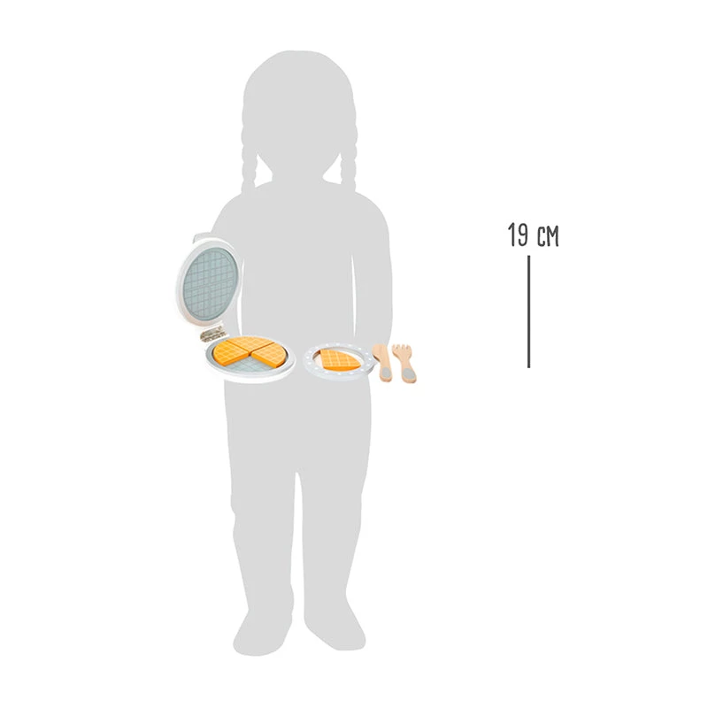 It’s waffle time! All foodies will get their breakfast with this wooden waffle iron. This easy-to-use kitchen appliance in a modern design belongs in every play kitchen! The practice waffle iron comes with four waffle slices and a plate with utensils. The on-and-off button can be turned, and the children can decide if the waffles are finished or if they need a bit more time. So who wants a waffle?