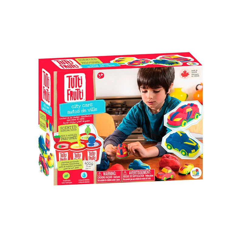 4-4.5oz tubs of Tutti Frutti modeling dough (blue, yellow, red and green), 2 car body molds, 4 platform cars with wheels.