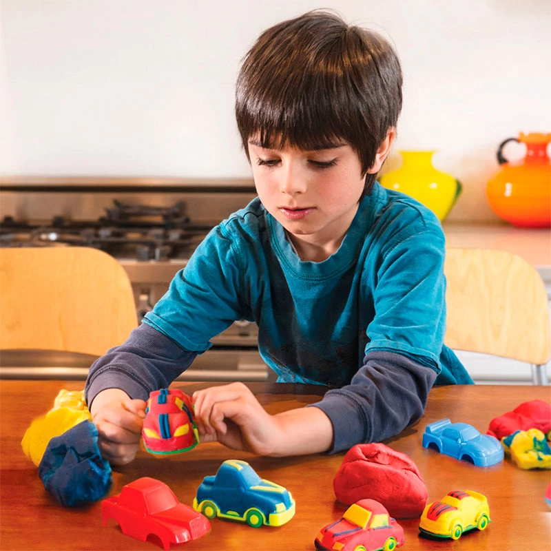 Rev up your imagination! Choose to cover and decorate the 4 plastic platform cars, or use the 2 car molds to make your personal creations and wheels. The ideal set for car fans, their beautiful creations can participate in the biggest races!