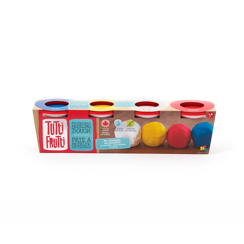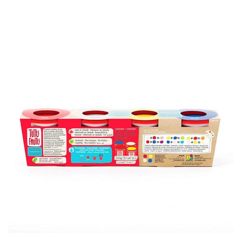 In this set: 4 tubs of Tutti Frutti unscented modeling dough in white, blue, red, and yellow.ย