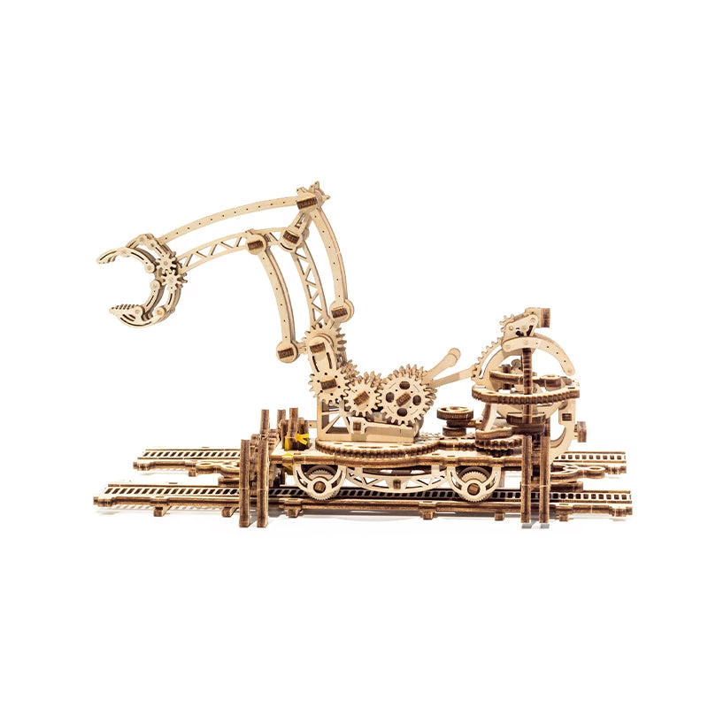 Developing its new fascinating series,Β Mechanical Town, UGears presents the secondΒ model to the collection: the Rail Manipulator. Set up in the dock of Mechanical Town not far from theΒ Robot FactoryΒ (the third model),Β the Rail Manipulator is designed to make sure the fun goes on after the assembly is completed. With its articulated claw, the UGears Manipulator can load and move the freight crates in the Carriage with an extraordinary β up toΒ 0.4Β inch β preciseness. Based on the original prototypes, the Manipulator will teach you about the operational and constructional peculiarities of the real-life machines, such as cranes, excavators, robotic arms, etc; their mechanics and functionality. Speaking of extras, with the Manipulator itself, you also receive two sections of rails, the shed under construction, two shipping crates with doors, a crane, freight carriage, and five characters.