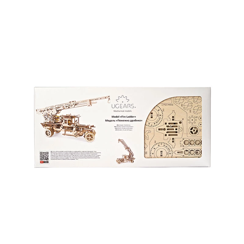 UGears Fire Truck with Ladder is a self propelled dynamic model that works like a true fire truck. This model belongs to the class of the new generation of UGears. It is much more sophisticated and its mechanical running part is more real. The model function like a real Rescue & Fire Truck with turning foot, moving apart & ascending ladder which transforms into a real crane with hook. This model runs, shifts, steers, and accelerates just like a real truck. First βfuel upβ by turning the lever on top of the cab. Then βstartβ the engine with the shifter in βidleβ and see four pistons moving realistically under the folding hood. Open the cabin door to find a fully-functioning steering wheel and even a working gas pedal. Ready for a ride? Shift the transmission into βforwardβ or βreverseβ and watch your truck head back.Β UGears Fire Truck is equipped with the retractable 3-Section Fire Ladder on a rotating platform. And when fully extended has a length of 27.5 in. The Fire Ladder has several controls. Press the lever and lift up the ladder. Turn the platform to the right or to the left. Fix the selected position with a special ratchet.