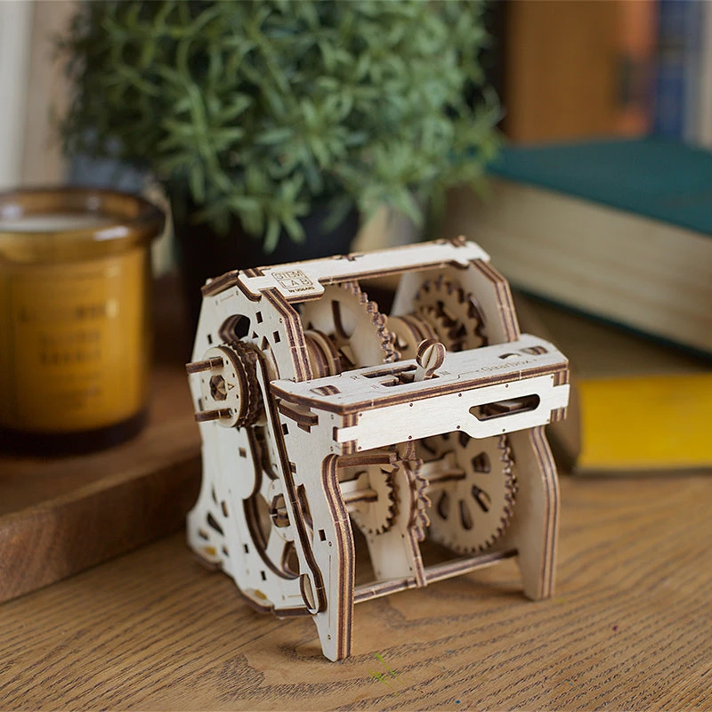 The Gearbox is a stylised educational model, an interactive study guide to the mechanism, only for learning its essentials and principles of working. A mechanical gearbox is a reducer that provides speed and torque conversions from a motor to the driving wheels. After assembly, you can experiment with the Ugears manual Gearsbox, by turns, choose I, II, III, or reverse with a kinematic pair of gears with different ratios and, rotating the actuator handle clock-wise, you can watch and control the rotation speed of the layshaft and drive shaft. In a Position “N” – idle in which both clutch gears of layshaft remain uncoupled and idling; the First Gear makes the layshaft and gears rotate with the lowest speed; the Second Gear lets the drive shaft along with the flywheel rotate with an average speed and the Third Gear allows the layshaft and all gears rotate with the highest speed. Switch on the Reverse gear and see how the driving clutch gear moves to the left towards gear “R” and connects to it transferring the rotation to the lower gear arrangement and propelling the layshaft and all gears to rotate in reverse.