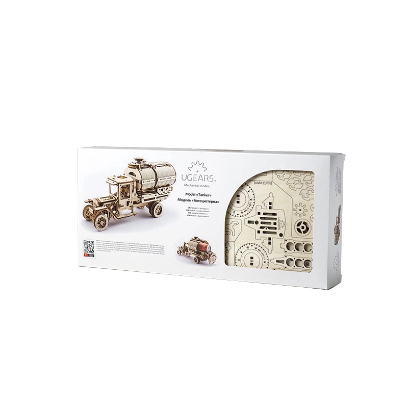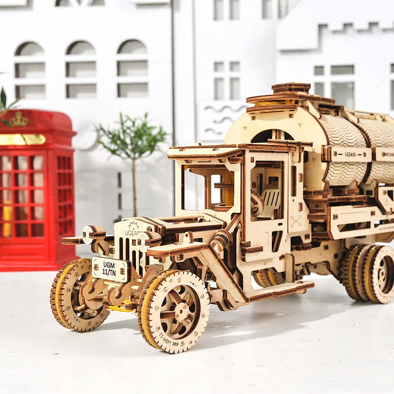 The UGears Truck represents a new generation of UGears Mechanical Models with greater sophistication and more features. This model runs, shifts, steers, and accelerates just like a real truck. First ‘fuel up’ by turning the lever on top of the cab. Then ‘start’ the engine with the shifter in ‘idle’ and see four pistons moving realistically under the folding hood. Open the cabin door to find a fully functioning steering wheel and even a working gas pedal. Ready for a ride? Shift the transmission into ‘forward’ or ‘reverse’ and watch your truck head back.
